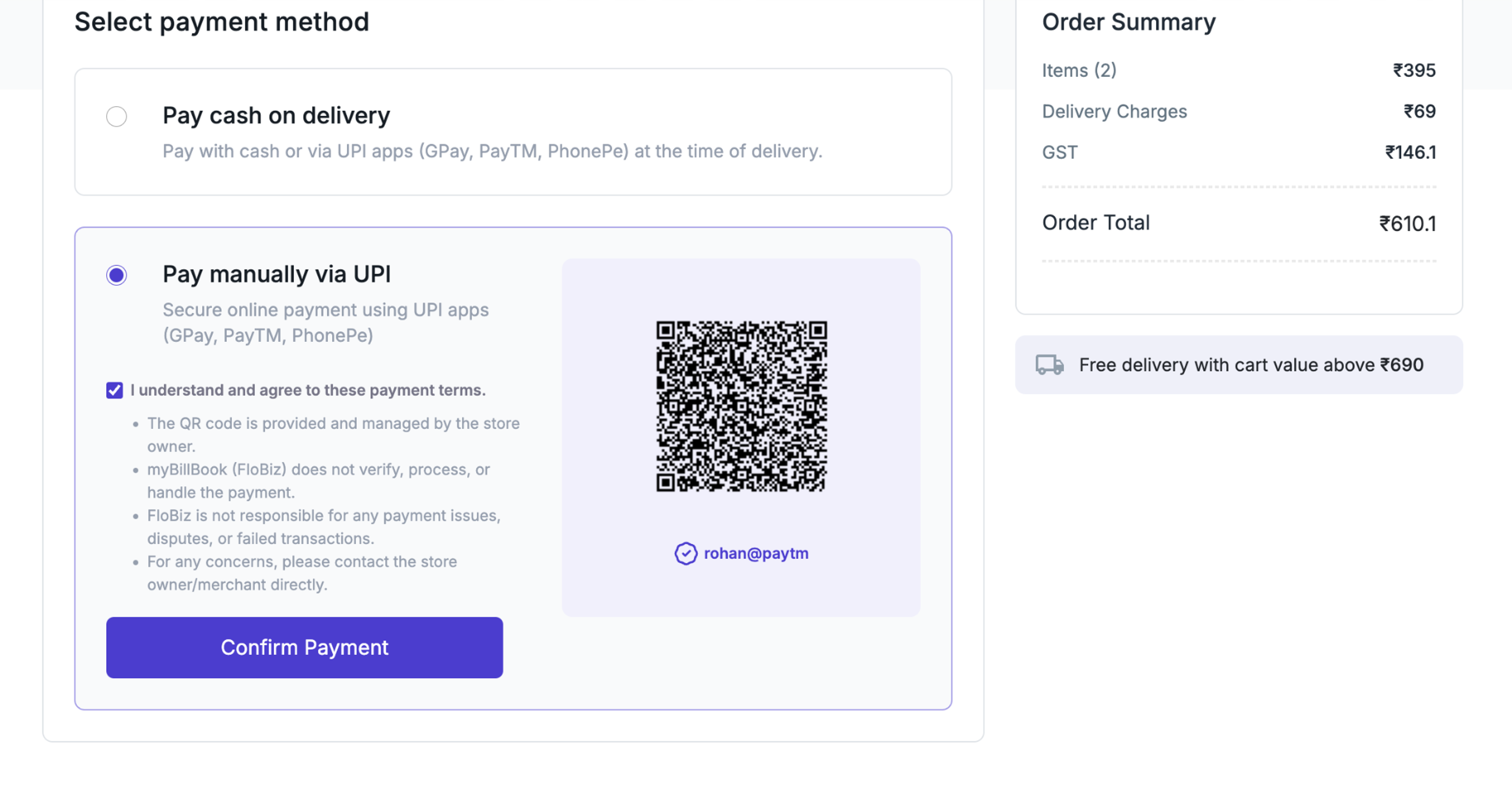 You can now offer UPI-based payments on your myBillBook online store alongside Cash on Delivery (COD). This gives your customers the flexibility to choose their preferred payment method at checkout, boosting convenience and order success rates.