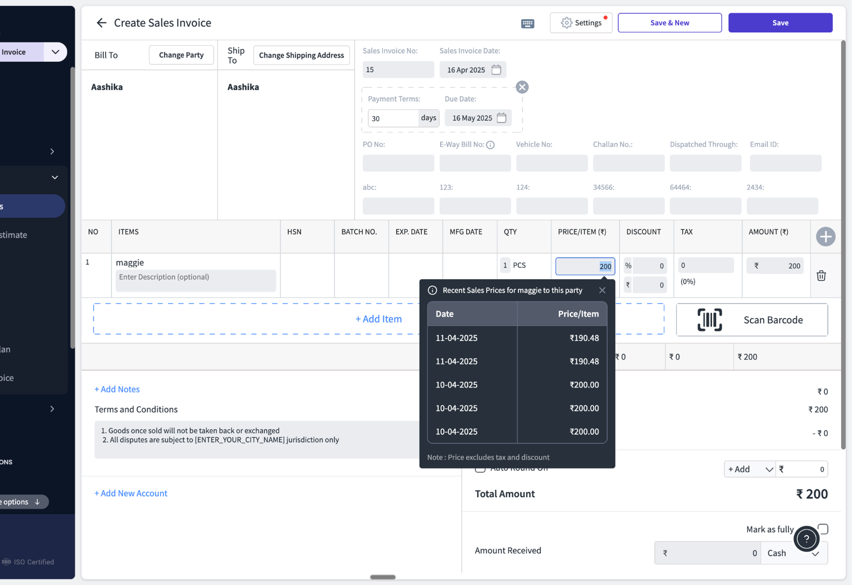 This feature lets you see the last 5 prices at which a particular item was sold or purchased for a specific customer or supplier. When you add an item while billing a repeat customer, MyBillBook will show a price history—helping you apply consistent rates with just a click.