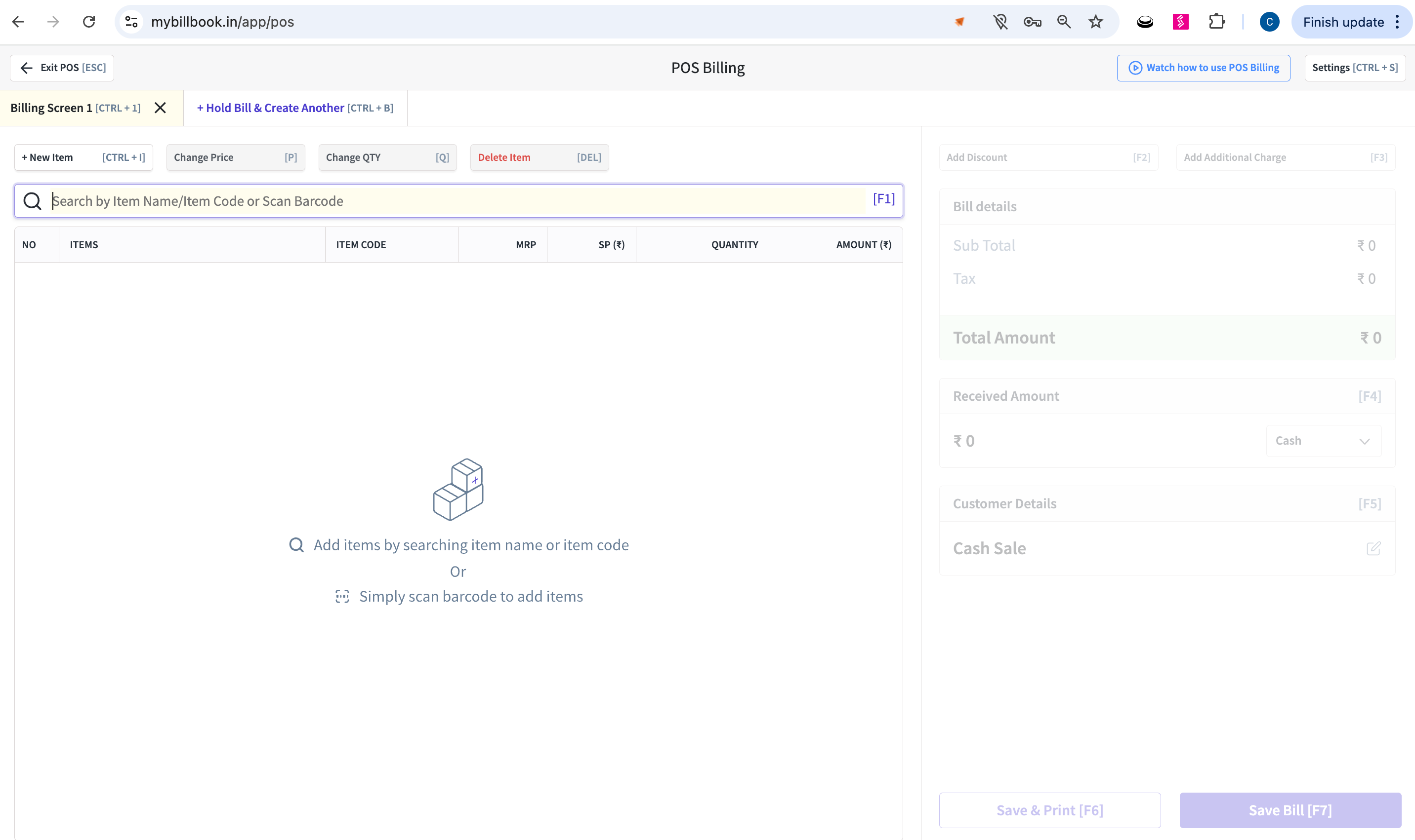 POS Billing screen on Web browser