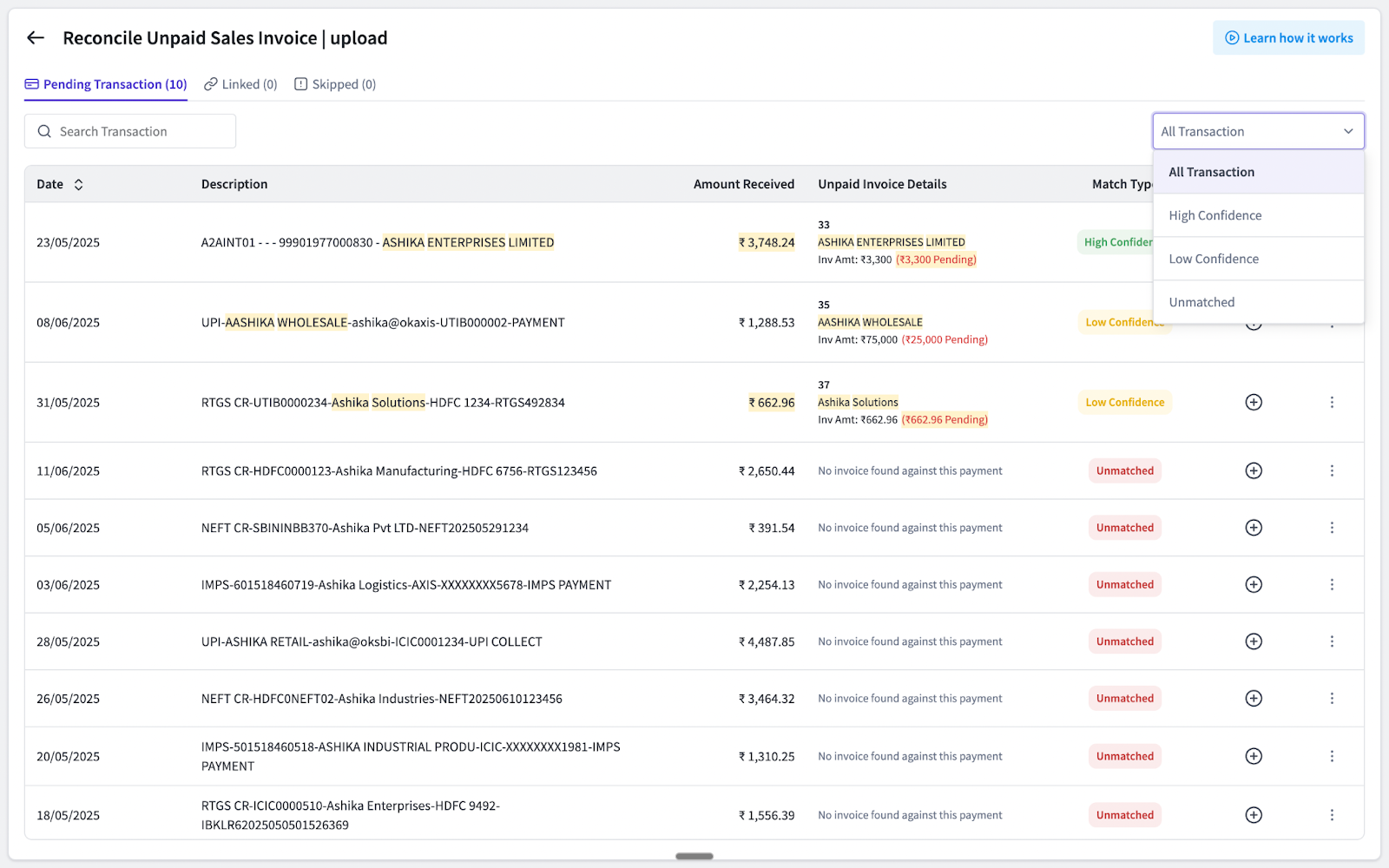 Matched transactions with Confidence scores