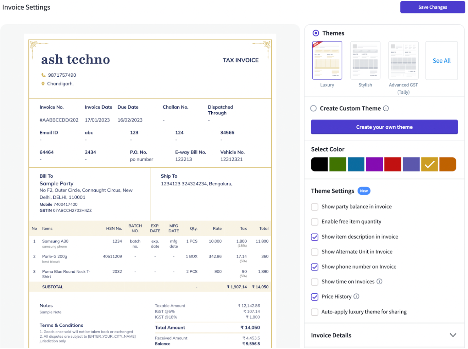 The Luxury Theme is a premium invoice design introduced to improve brand perception. It's automatically showcased first during onboarding and also applied when invoices are shared via WhatsApp, even if a different theme is currently selected.